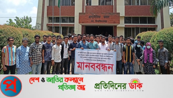 মঙ্গলবার (১৬ আগস্ট) তিন দফা দাবিতে বিশ্ববিদ্যালয়ের প্রশাসনিক ভবনের সামনে এই মানববন্ধন করা হয়। একই সাথে প্রশাসনিক কর্মকর্তা বরাবর স্মারকলিপি প্রদান করেছেন বিশ্ববিদ্যালয়ের সাধারণ শিক্ষার্থীরা।