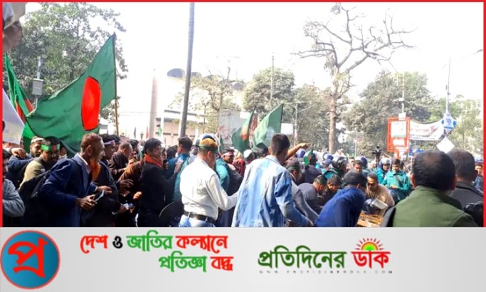 পুলিশের ব্যারিকেড ভেঙে রাজধানীর শাহবাগে অবস্থান নিয়েছেন বিডিআর বিদ্রোহের ঘটনায় চাকরিচ্যুত সদস্য ও ভুক্তভোগী পরিবারের স্বজনেরা। বৃহস্পতিবার (৯ জানুয়ারি) দুপুর দেড়টার দিকে কেন্দ্রীয় শহীদ মিনার থেকে মিছিল নিয়ে এসে পুলিশের বাঁধার মুখে পড়েন তারা। পরে পুলিশের ব্যারিকেড ভেঙে শাহবাগ মোড়ে অবস্থান নেন । এতে সড়কে যান চলাচল বন্ধ হয়ে গেছে।