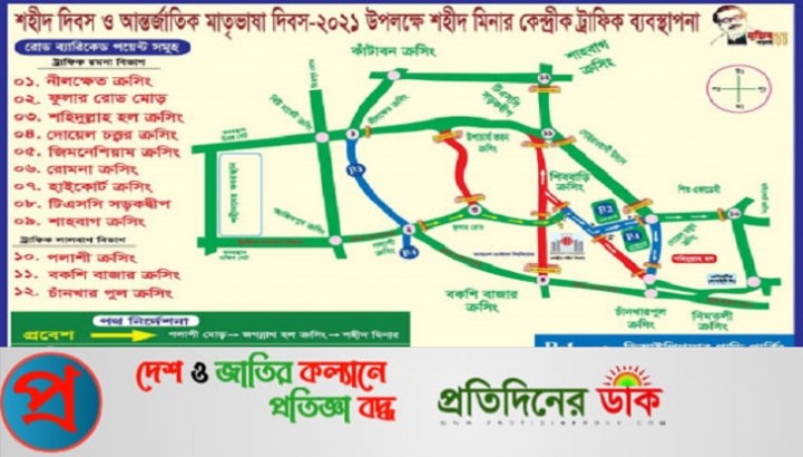 ২১ ফেব্রুয়ারি ভোর ৫টায় সায়েন্সল্যাব থেকে নিউমার্কেট ও কাঁটাবন ক্রসিং থেকে নীলক্ষেত ক্রসিং এবং ফুলবাড়িয়া ক্রসিং থেকে চাঁনখারপুল ক্রসিং পর্যন্ত প্রভাতফেরি উপলক্ষে সব ধরনের যাত্রীবাহী গাড়ির প্রবেশ নিষিদ্ধ থাকবে।