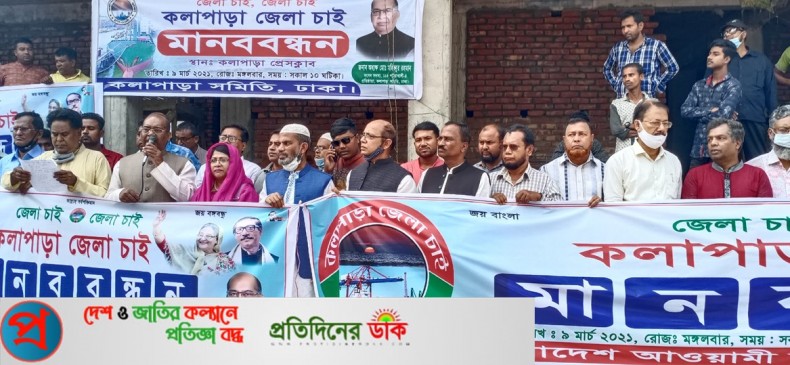 কলাপাড়া উপজেলাকে জেলায় রুপান্তরের দাবিতে মানববন্ধন অনুষ্ঠিত হয়েছে। “কলাপাড়া জেলা চাই আন্দোলন” কমিটির আয়োজনে মঙ্গলবার সকাল দশটায় স্থানীয় প্রেসক্লাবের সম্মুখ্যে প্রায় ১ কিলোমিটার সড়ক জুড়ে এ মানববন্ধন অনুষ্ঠিত হয়। ঘন্টা ব্যাপী এ কর্মসূচীতে বিভিন্ন শিক্ষা প্রতিষ্ঠান, ব্যবসায়ী সংগঠন, সামাজিক ও সাংস্কৃতিক সংগঠনের ‘জেলা চাই’ ব্যানার নিয়ে হাজার হাজার মানুষ অংশগ্রহন করেন।