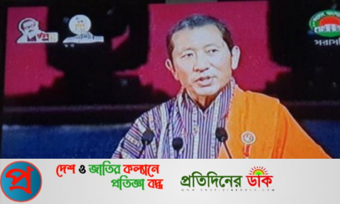 বঙ্গবন্ধু শেখ মুজিবুর রহমানের জন্মবার্ষিকী ও স্বাধীনতার সুবর্ণজয়ন্তী উপলক্ষে আয়োজিত জাতীয় প্যারেড গ্রাউন্ডে এক অনুষ্ঠানে বুধবার গেস্ট অব অনার হিসেবে বক্তৃতা করেন ভুটানের প্রধানমন্ত্রী লোটে শেরিং- পিআইডি