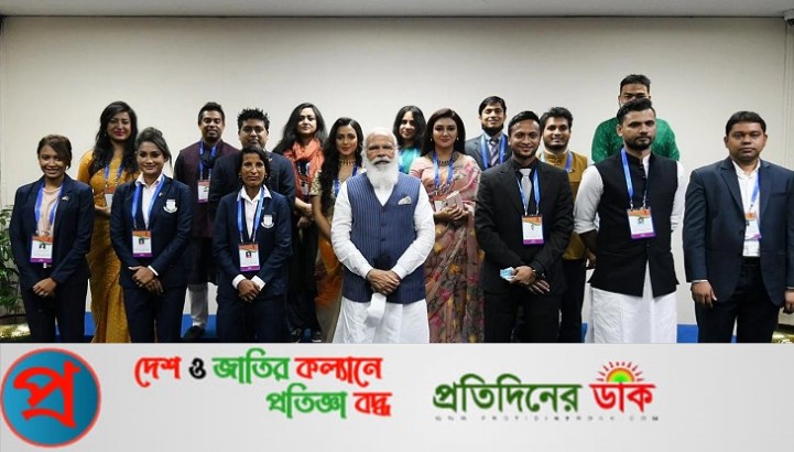 পরে মোদীর সঙ্গে দাঁড়িয়ে ছবিও তোলেন তারা। যেখানে সামনের সারিতে ভারতীয় প্রধানমন্ত্রীর বাঁ পাশে ছিলেন সাকিব আল হাসান ও মাশরাফী বিন মোর্ত্তজা। ডান পাশে নারী দলের অধিনায়ক সালমা খাতুন ও জাহানারা আলম।