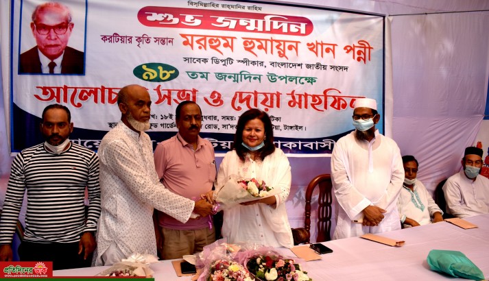 টাঙ্গাইলের করটিয়ায় আলোচনা ও দোয়া মোনাজাতের মধ্য দিয়ে বাংলাদেশ জাতীয় সংসদের সাবেক ডেপুটি স্পীকার মরহুম হুমায়ন খান পন্নীর ৯৮তম জন্ম দিন পালিত হয়েছে। এ উপলক্ষে বুধবার (১৮ নভেম্বর) সকালে করটিয়া এলাকাবাসীর আয়োজনে মসজিদ রোড ফুড গার্ডেনের সামনে এ আলোচনা সভা অনুষ্ঠিত হয়। আয়োজিত অনুষ্ঠানে প্রধান অতিথির বক্তব্য রাখেন মরহুম হুমায়ন খান পন্নীর বড় মেয়ে সোনিয়া খান পন্নী। সাদ’ত বিশ্ববিদ্যালয় কলেজের সাবেক ভিপি মনিরুল ইসলাম মিন্টুর সভাপতিত্বে বক্তব্য রাখেন বাসাইল-সখিপুরের সাবেক এমপি মোরশেদ আলী খান পন্নী টিপু, টাঙ্গাইল জেলা বিএনপির সাংগঠনিক সম্পাদক আব্দুল হামিদ তালুকদার, সাদ’ত কলেজ ছাত্র সংসদের সাবেক সভাপতি সৈয়দ জাদিত হোসেন জাদিত, জেলা স্বেচ্ছাসেবক দলের সিনিয়র যুগ্ম সাধারণ সম্পাদক কামরুল হাসান উজ্জল প্রমুখ। অনুষ্ঠানটি সঞ্চালনায় ছিলেন সোলায়মান হায়দার টুটুল। এসময় পেশাজিবী সংগঠন, এলাকার গন্য মান্য ব্যক্তি বর্গ ও বিভিন্ন রাজনৈতিক নেতা কর্মীরা উপস্থিত ছিলেন। অনুষ্ঠানের শুরুতেই প্রধান অতিথিকে ফলেল সুভেচ্ছা দিয়ে বরণ করে নেন করটিয়ার এলাকাবাসি।